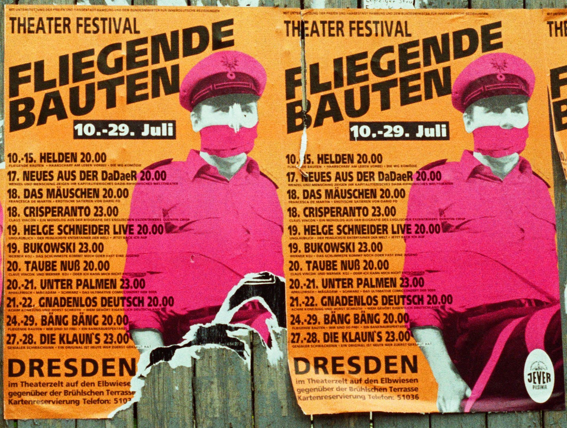 Dresden 1990. Dort haben wir ein Theaterfestival organisiert und Theatergruppen aus West und Ost eingeladen. Wir, die Fliegenden Bauen haben dort zwei unserer Stücke gezeigt. HELDEN und BÄNG BÄNG.