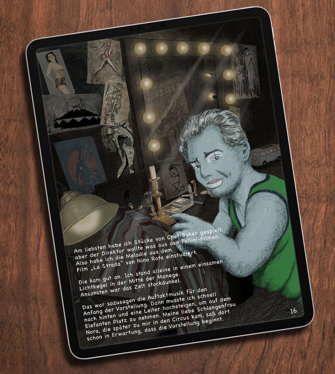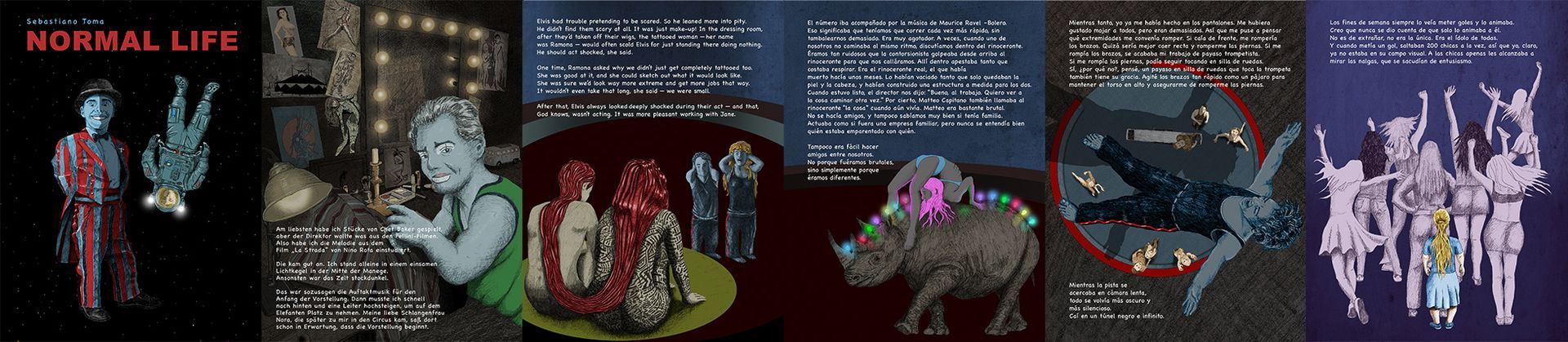 An illustrated story from the lives of a little-statured couple in a 1970s Italian circus. PDF File- 75 Pages- Full color- File size: ca. 50 MB - 6,00 €